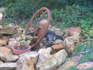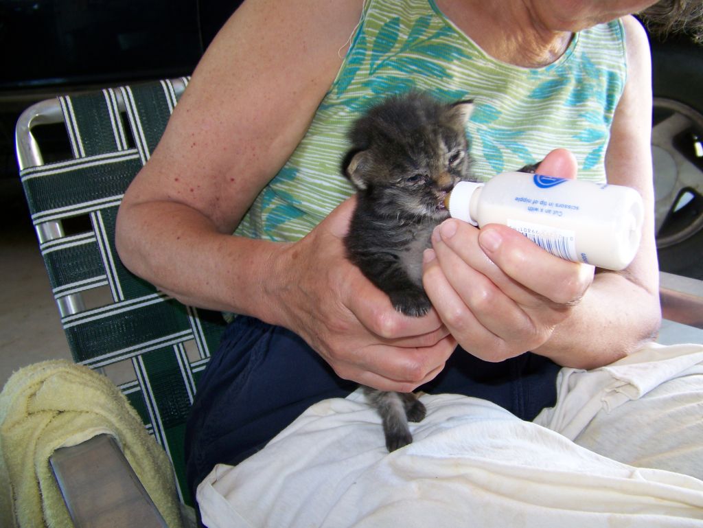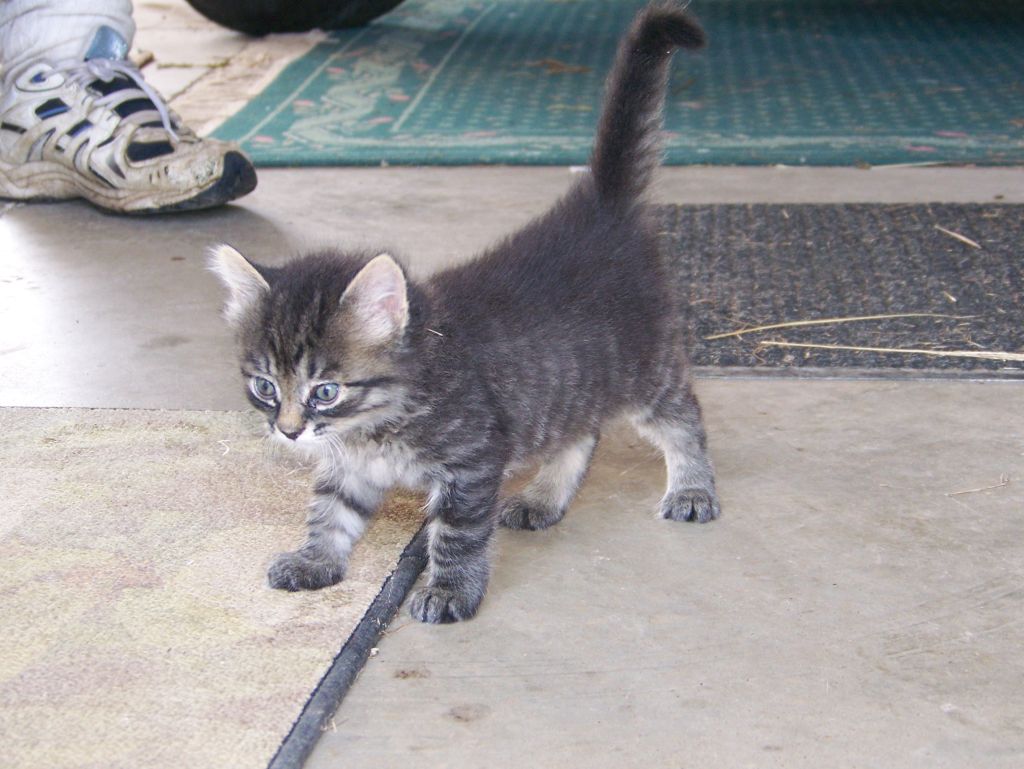 Previously, Trish had spotted evidence of a cat hanging around our barn.  Early in the spring, we heard strange noises in the barn and discovered a litter of kittens:  Nucy's older half siblings.  Early in the summer, Trish saw the same mother cat near the house carting her kittens off to a new location.  Later that day we heard the same strange noise coming from the front porch.  It was Nucy crying.  We left her there overnight hoping that her mother would return.  It rained, of course, and she spend a hideous night cold, wet, hungry, alone and she cried the whole time.  When she was still there the next day, we figured she'd been abandoned, so Trish rescued her.  We wanted a barn cat to catch mice.  You can imagine how that worked out.  The rest, as they say, is history.